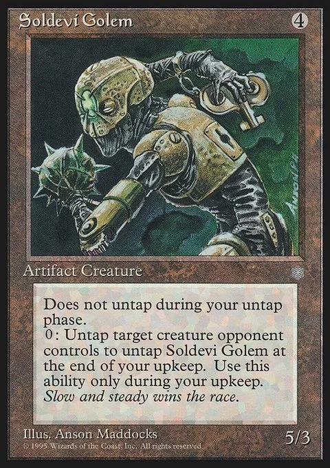 Does not untap during your untap phase.0: Untap target creature opponent controls to untap Soldevi Golem at the end of your upkeep. Use this ability only during your upkeep.