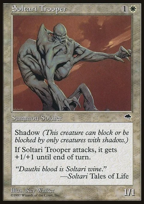 Shadow (This creature can block or be blocked by only creatures with shadow.) Whenever Soltari Trooper attacks, it gets +1/+1 until end of turn.