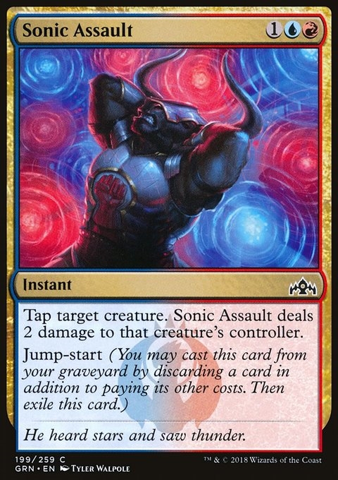 Tap target creature. Sonic Assault deals 2 damage to that creature's controller. Jump-start (You may cast this card from your graveyard by discarding a card in addition to paying its other costs. Then exile this card.)