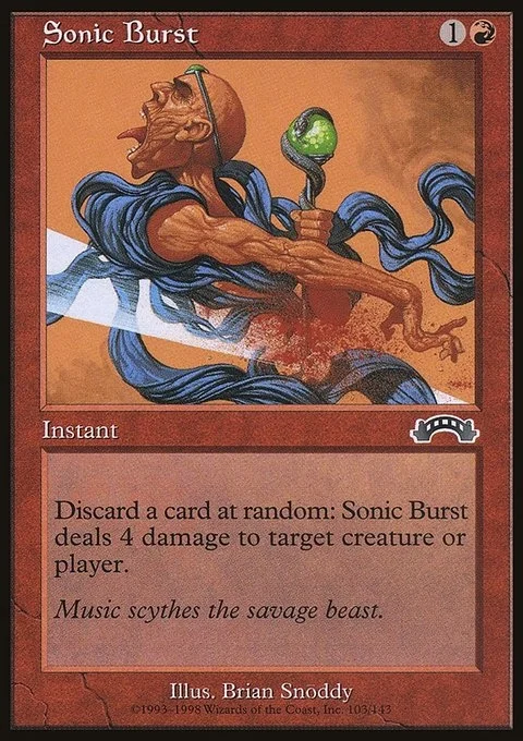 As an additional cost to cast this spell, discard a card at random. Sonic Burst deals 4 damage to any target.