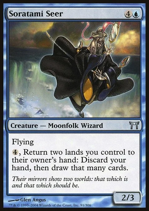 Flying {4}, Return two lands you control to their owner's hand: Discard all the cards in your hand, then draw that many cards.