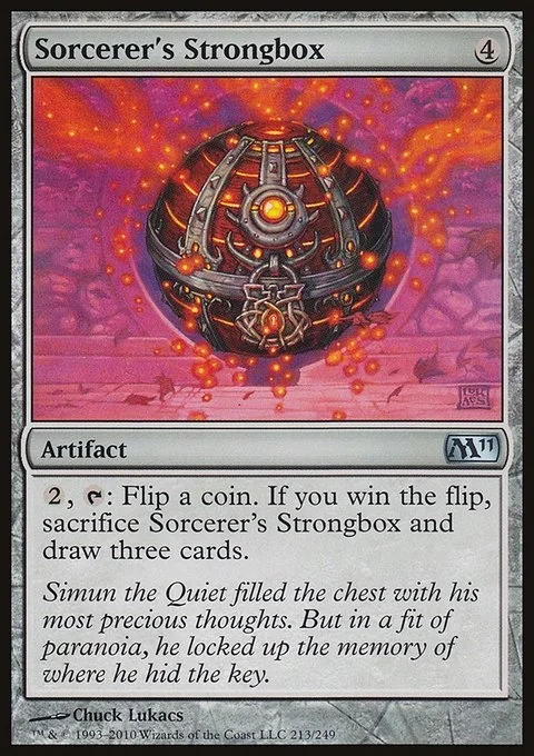 {2}, {T}: Flip a coin. If you win the flip, sacrifice Sorcerer's Strongbox and draw three cards.