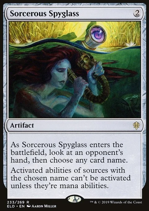 As Sorcerous Spyglass enters the battlefield, look at an opponent's hand, then choose any card name. Activated abilities of sources with the chosen name can't be activated unless they're mana abilities.