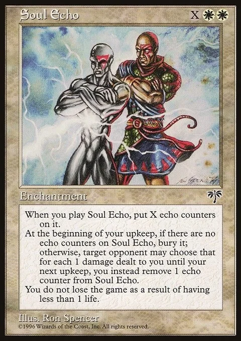 When you play Soul Echo, put X echo counters on it. At the beginning of your upkeep, if there are no echo counters on Soul Echo, bury it; otherwise, target opponent may choose that for each 1 damage dealt to you until your next upkeep, you instead remove 1 echo counter from Soul Echo.You do not lose the game as a result of having less than 1 life.