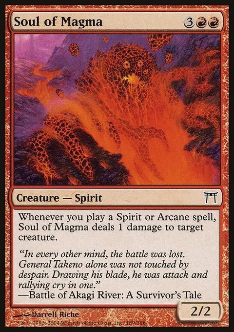 Whenever you cast a Spirit or Arcane spell, Soul of Magma deals 1 damage to target creature.