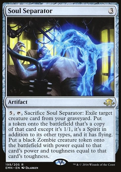 {5}, {T}, Sacrifice Soul Separator: Exile target creature card from your graveyard. Create a token that's a copy of that card, except it's 1/1, it's a Spirit in addition to its other types, and it has flying. Create a black Zombie creature token with power equal to that card's power and toughness equal to that card's toughness.