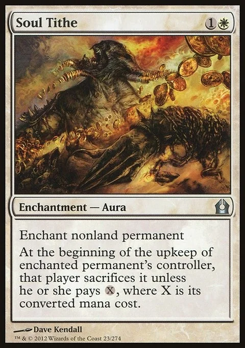 Enchant nonland permanent At the beginning of the upkeep of enchanted permanent's controller, that player sacrifices it unless they pay {X}, where X is its converted mana cost.