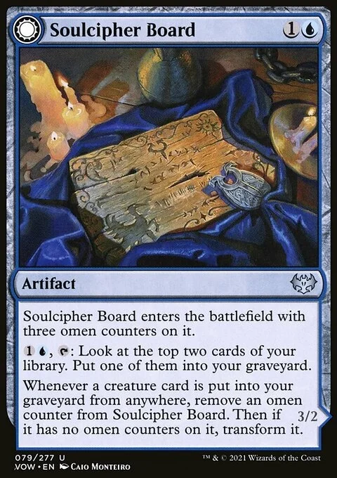 Whenever a creature card is put into your graveyard from anywhere, remove an omen counter from Soulcipher Board. Then if it has no omen counters on it, transform it.