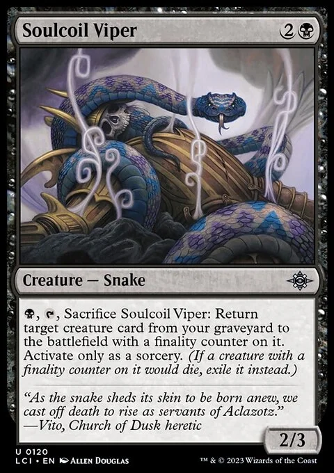 {B}, {T}, Sacrifice Soulcoil Viper: Return target creature card from your graveyard to the battlefield with a finality counter on it. Activate only as a sorcery. (If a creature with a finality counter on it would die, exile it instead.)
