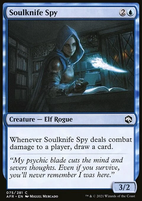 Whenever Soulknife Spy deals combat damage to a player, draw a card.