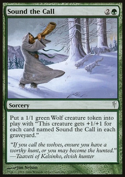 Create a 1/1 green Wolf creature token. It has "This creature gets +1/+1 for each card named Sound the Call in each graveyard."