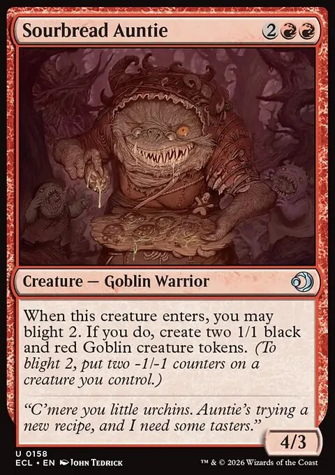 When this creature enters, you may blight 2. If you do, create two 1/1 black and red Goblin creature tokens. (To blight 2, put two -1/-1 counters on a creature you control.)