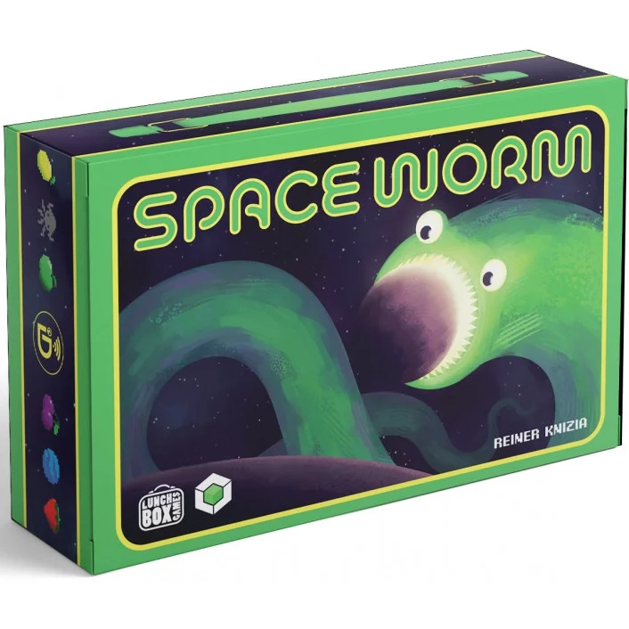Space Worm is a roll-and-write game by legendary designer Dr Reiner Knizia set in a retro arcade universe. Two to six players draft dice to race through space, devouring planets, munching fruit, and trying not to accidentally eat their own tails!