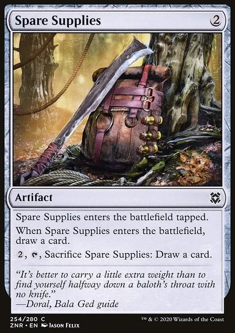 Spare Supplies enters the battlefield tapped. When Spare Supplies enters the battlefield, draw a card. {2}, {T}, Sacrifice Spare Supplies: Draw a card.