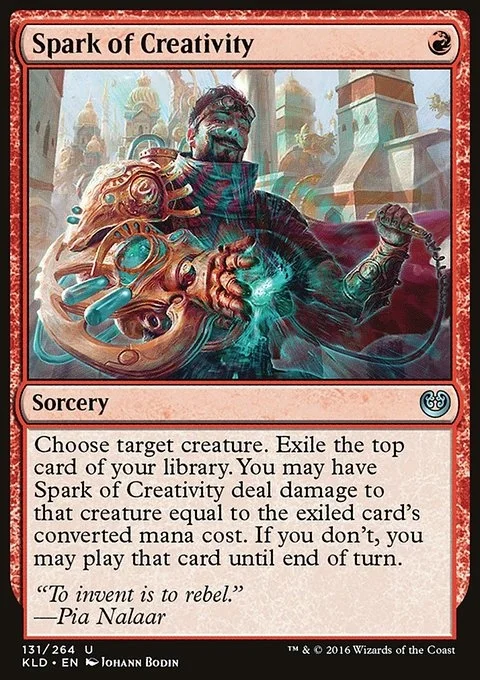 Choose target creature. Exile the top card of your library. You may have Spark of Creativity deal damage to that creature equal to the exiled card's mana value. If you don't, you may play that card until end of turn.