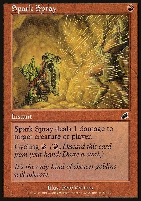 Spark Spray deals 1 damage to any target. Cycling {R} ({R}, Discard this card: Draw a card.)