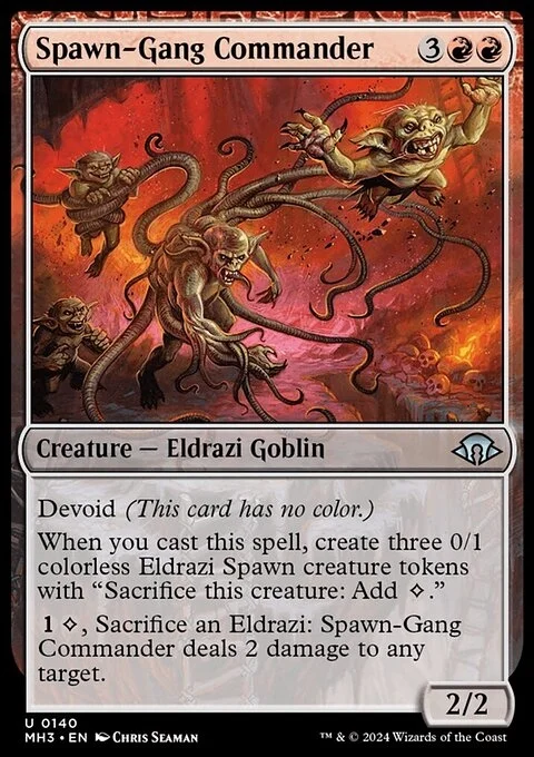 Devoid (This card has no color.) When you cast this spell, create three 0/1 colorless Eldrazi Spawn creature tokens with "Sacrifice this creature: Add {C}." {1}{C}, Sacrifice an Eldrazi: Spawn-Gang Commander deals 2 damage to any target.
