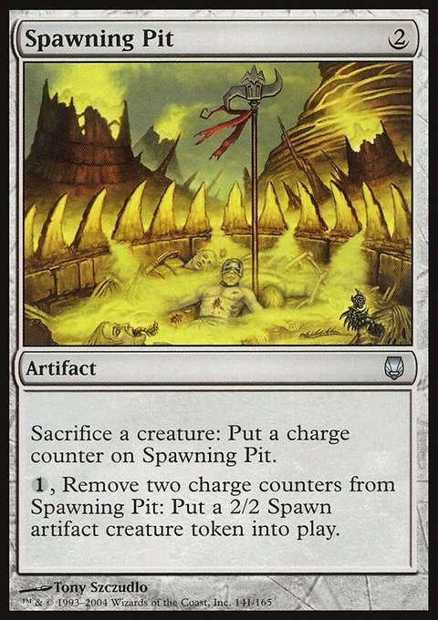 Sacrifice a creature: Put a charge counter on Spawning Pit. {1}, Remove two charge counters from Spawning Pit: Create a 2/2 colorless Spawn artifact creature token.