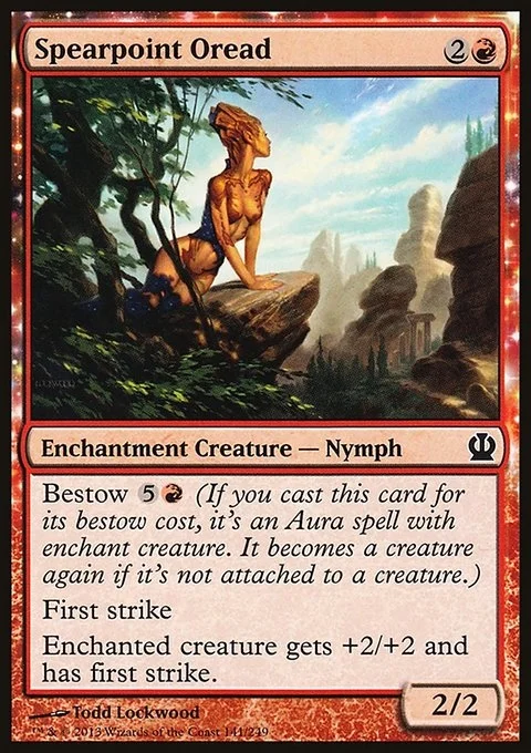 Bestow {5}{R} (If you cast this card for its bestow cost, it's an Aura spell with enchant creature. It becomes a creature again if it's not attached to a creature.) First strike Enchanted creature gets +2/+2 and has first strike.