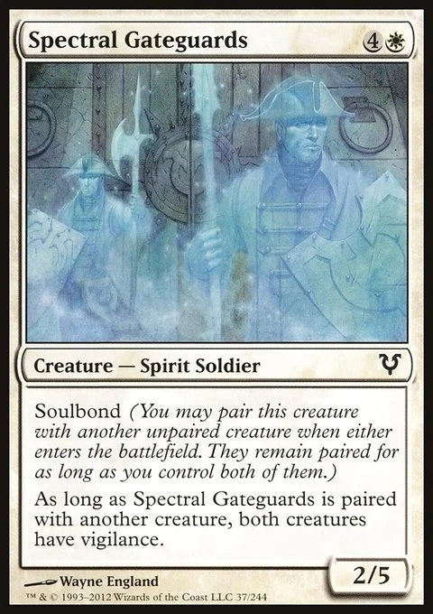 Soulbond (You may pair this creature with another unpaired creature when either enters the battlefield. They remain paired for as long as you control both of them.) As long as Spectral Gateguards is paired with another creature, both creatures have vigilance.