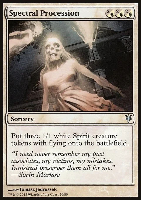 Create three 1/1 white Spirit creature tokens with flying.