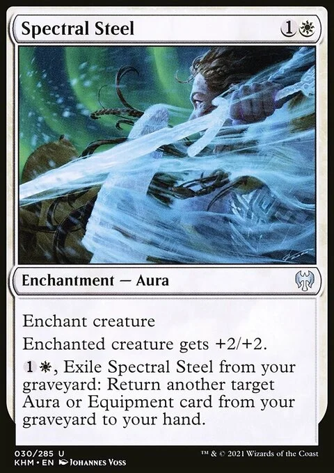 Enchant creature Enchanted creature gets +2/+2. {1}{W}, Exile Spectral Steel from your graveyard: Return another target Aura or Equipment card from your graveyard to your hand.