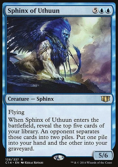 Flying When Sphinx of Uthuun enters the battlefield, reveal the top five cards of your library. An opponent separates those cards into two piles. Put one pile into your hand and the other into your graveyard.