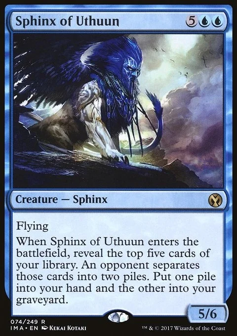 Flying When Sphinx of Uthuun enters the battlefield, reveal the top five cards of your library. An opponent separates those cards into two piles. Put one pile into your hand and the other into your graveyard.