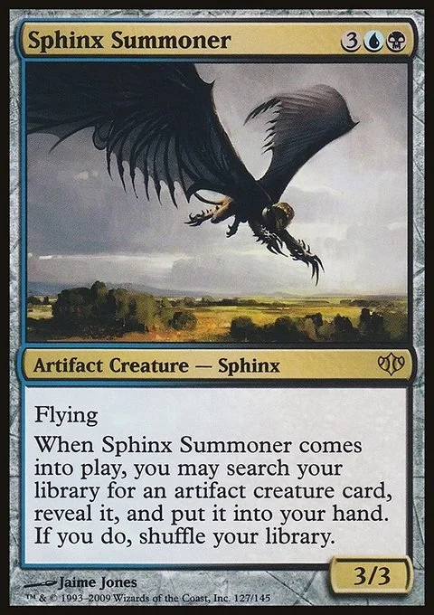 Flying When Sphinx Summoner enters the battlefield, you may search your library for an artifact creature card, reveal it, put it into your hand, then shuffle.