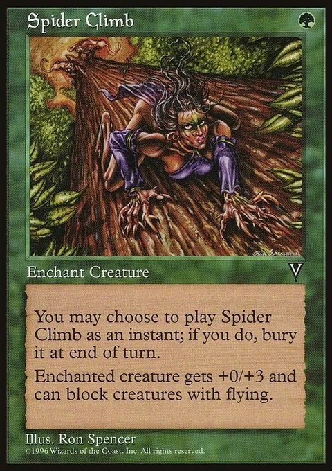 You may cast Spider Climb as though it had flash. If you cast it any time a sorcery couldn't have been cast, the controller of the permanent it becomes sacrifices it at the beginning of the next cleanup step. Enchant creature Enchanted creature gets +0/+3 and has reach. (It can block creatures with flying.)