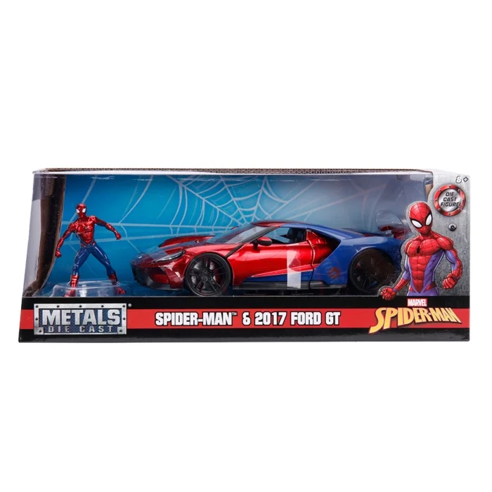 This 2017 Ford GT takes its styling cues directly from the friendly neighborhood web-slinger, Spider-Man! The 1/24th scale vehicle features a die-cast body with a detailed interior and opening doors, hood and an adjustable spoiler, as well as working wheels with rubber tyres. The officially licensed vehicle also comes with a 2.75” Spider-Man die-cast figure, so you can display the web-slinger next to his ride.