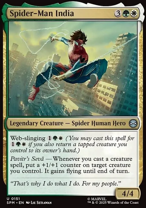 Web-slinging {1}{G}{W} (You may cast this spell for {1}{G}{W} if you also return a tapped creature you control to its owner's hand.) Pavitr's Seva — Whenever you cast a creature spell, put a +1/+1 counter on target creature you control. It gains flying until end of turn.