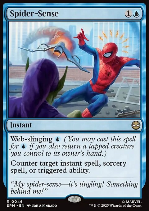 Web-slinging {U} (You may cast this spell for {U} if you also return a tapped creature you control to its owner's hand.) Counter target instant spell, sorcery spell, or triggered ability.
