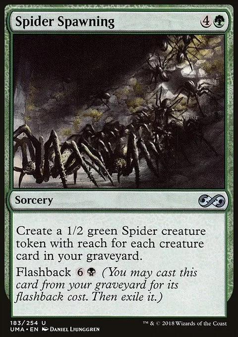 Create a 1/2 green Spider creature token with reach for each creature card in your graveyard. Flashback {6}{B} (You may cast this card from your graveyard for its flashback cost. Then exile it.)