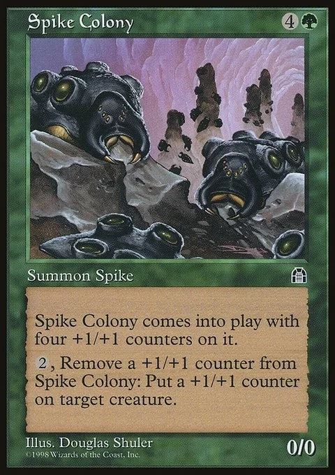 Spike Colony enters the battlefield with four +1/+1 counters on it. {2}, Remove a +1/+1 counter from Spike Colony: Put a +1/+1 counter on target creature.