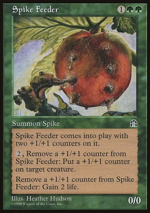 Spike Feeder comes into play with two +1/+1 counters on it.2, Remove a +1/+1 counter from Spike Feeder: Put a +1/+1 counter on target creature.Remove a +1/+1 counter from Spike Feeder: Gain 2 life.