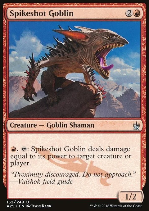 {R}, {T}: Spikeshot Goblin deals damage equal to its power to any target.