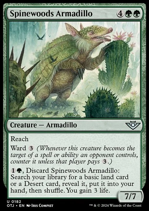 {1}{G}, Discard Spinewoods Armadillo: Search your library for a basic land card or a Desert card, reveal it, put it into your hand, then shuffle. You gain 3 life.