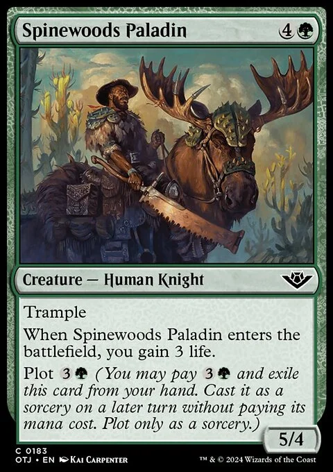 Trample When this creature enters, you gain 3 life. Plot {3}{G} (You may pay {3}{G} and exile this card from your hand. Cast it as a sorcery on a later turn without paying its mana cost. Plot only as a sorcery.)