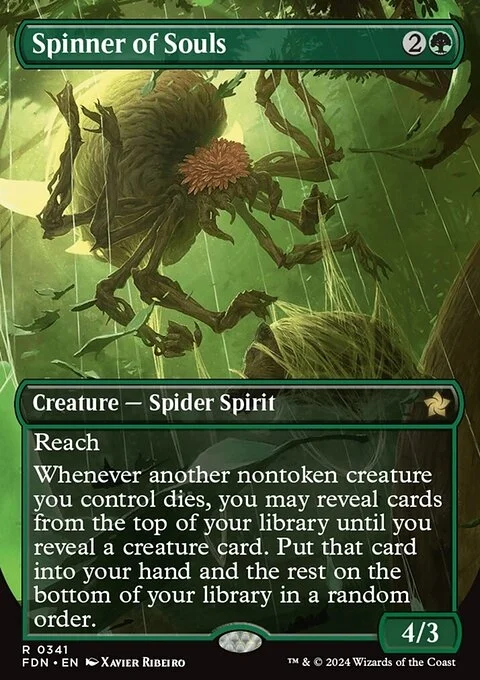 Reach Whenever another nontoken creature you control dies, you may reveal cards from the top of your library until you reveal a creature card. Put that card into your hand and the rest on the bottom of your library in a random order.