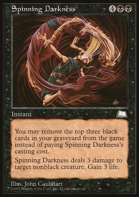 You may exile the top three black cards of your graveyard rather than pay this spell's mana cost. Spinning Darkness deals 3 damage to target nonblack creature. You gain 3 life.