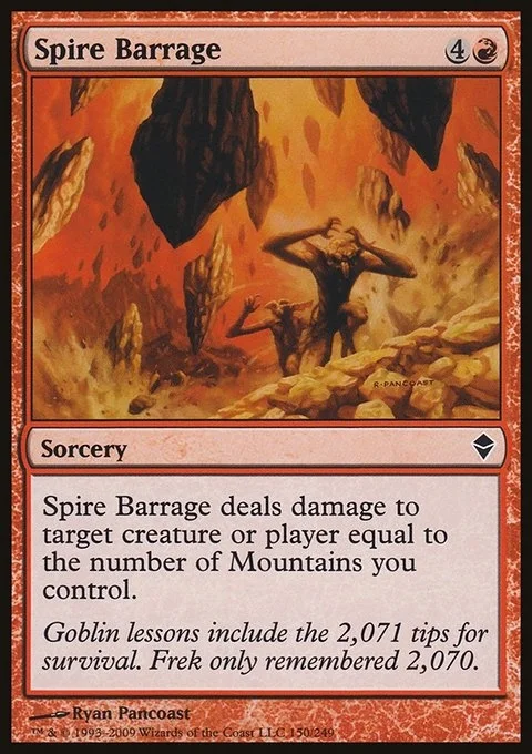 Spire Barrage deals damage to any target equal to the number of Mountains you control.