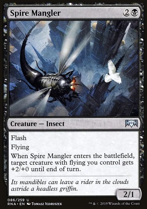 Flash Flying When Spire Mangler enters the battlefield, target creature with flying you control gets +2/+0 until end of turn.