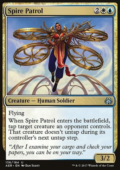 Flying When Spire Patrol enters the battlefield, tap target creature an opponent controls. That creature doesn't untap during its controller's next untap step.