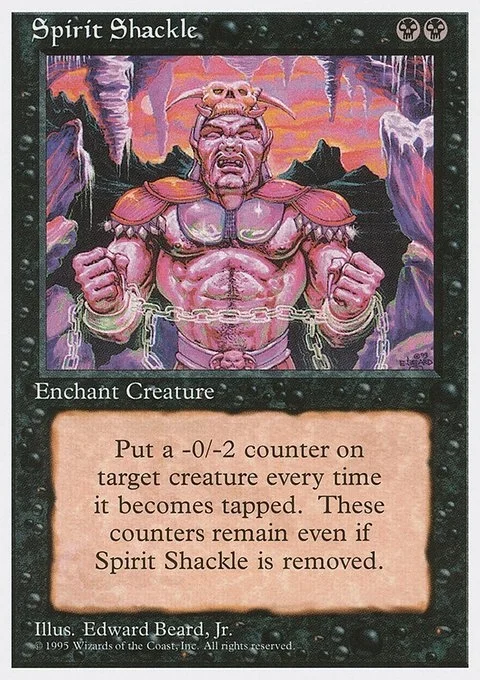 Put a -0/-2 counter on target creature every time it becomes tapped. These counters remain even if Spirit Shackle is removed.