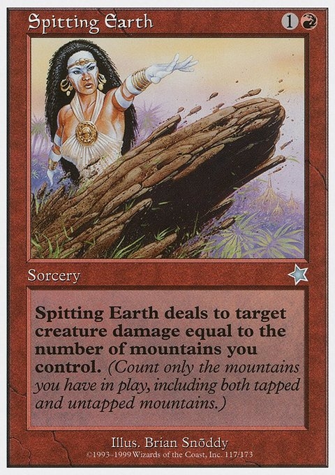 Spitting Earth deals to target creature damage equal to the number of mountains you control. (Count only the mountains you have in play, including both tapped and untapped mountains.)