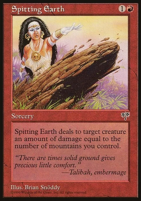 Spitting Earth deals damage to target creature equal to the number of Mountains you control.