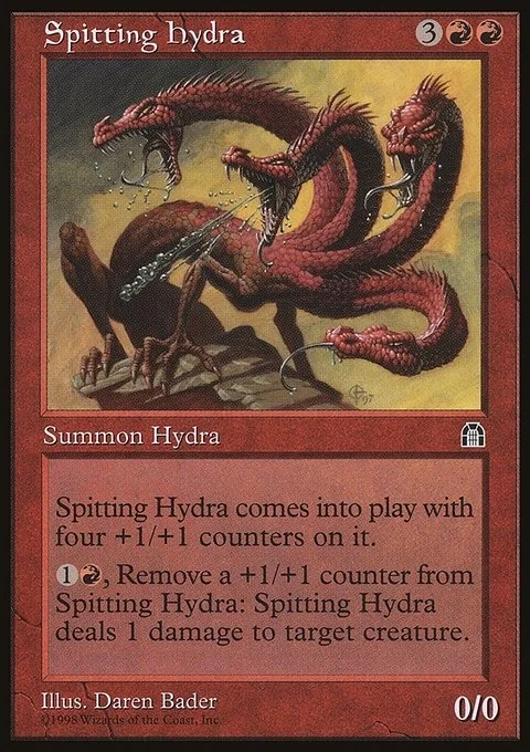 Spitting Hydra comes into play with four +1/+1 counters on it.1R, Remove a +1/+1 counter from Spitting Hydra: Spitting Hydra deals 1 damage to target creature.