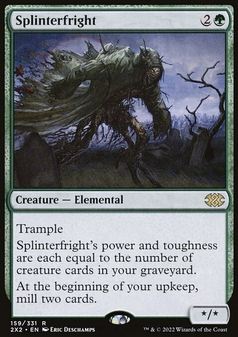 Trample Splinterfright's power and toughness are each equal to the number of creature cards in your graveyard. At the beginning of your upkeep, mill two cards. (Put the top two cards of your library into your graveyard.)