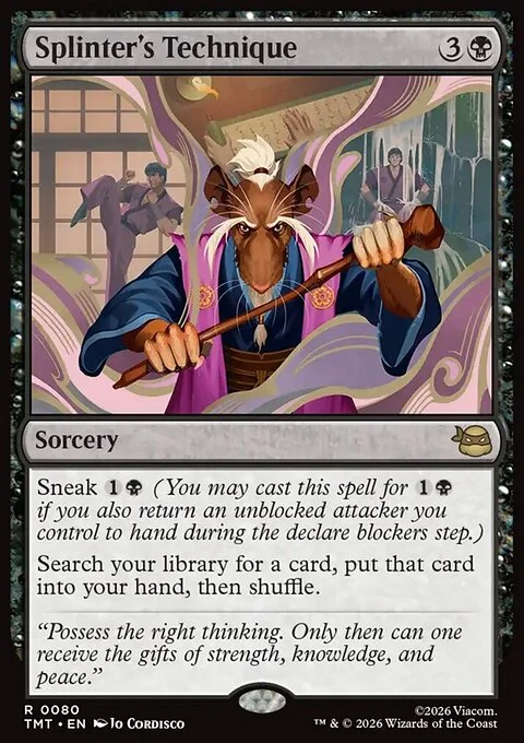 Sneak {1}{B} (You may cast this spell for {1}{B} if you also return an unblocked attacker you control to hand during the declare blockers step.) Search your library for a card, put that card into your hand, then shuffle.